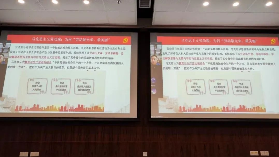 在该活动中,朱贞副教授作“以真理的精神学习马克思主义理论”的分享交流,他从“为什么学习马克思主义理论”、“学习马克思主义理论的态度”、“如何学习马克思主义理论”三个方面入手,并重点围绕“马克思主义劳动观”详细讲解。他指出,劳动是马克思主义理论体系的一个起始范畴和核心范畴。马克思和恩格斯以劳动为出发点和主线,发现了劳动在人和人类社会产生与发展中的重要作用,系统阐释了劳动历史观、劳动幸福观、劳动解放思想为主要内容的马克思主义劳动观,揭示了其中蕴含的劳动教育思想的深刻内涵。他还结合新中国成立以来国家层面对于劳动教育的表述,进一步说明我们党的教育方针不断发展完善,实现了与时俱进。特别是党的十八大以来,习近平总书记高度重视青少年劳动教育,强调“德智体美劳五育并举、全面发展,把劳动教育纳入人才培养全过程,贯通大中小学各学段和家庭、学校、社会各方面”,习近平总书记的重要论述为新时代加强劳动教育提供了根本遵循。