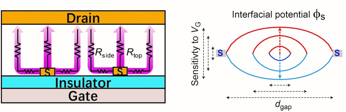 晶体管是微电子器件和电路的基本元件。该项研究针对一类垂直型晶体管,其电极是由纳米线、纳米管、或多孔金属等所构成的导电网络,这类晶体管可作为三维集成的基本单元,但是仍缺乏器件基础理论和一般设计原则,尤其是导电沟道的基本原理。该研究揭示了垂直晶体管工作的简明物理图景——其一,导电沟道是两类沟道的竞争结果,可近似为两种更简单器件的并联(图左);其二,界面电势受电场调控,其行为如同一条被拨动的“弦”(图右)。基于这个图景,进一步推导出了电流电压关系式,从而提供了这类晶体管的设计、制备和分析的一些普适性原则,以及影响其电流密度、亚阈值摆幅等性质的关键因素和调控方法。
