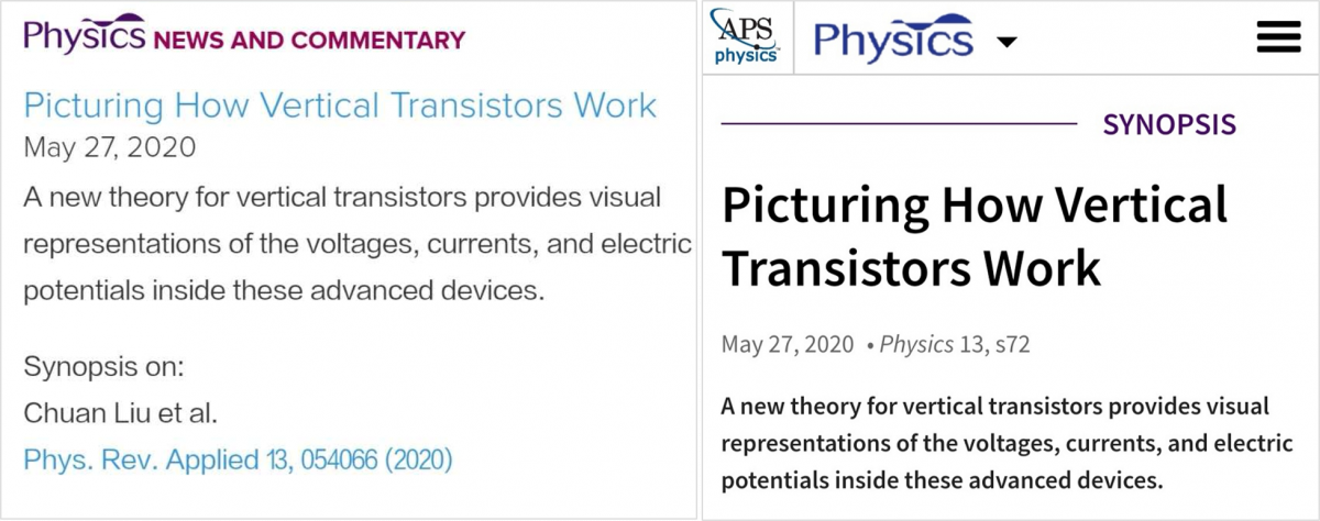 论文被《物理评论应用》期刊评为“Featured in Physics”并列入“News and commentary”。此外,美国物理学会APS写了一篇专栏介绍短文,题目是“描绘垂直晶体管如何工作”(https://physics.aps.org/articles/v13/s72),部分翻译如下——