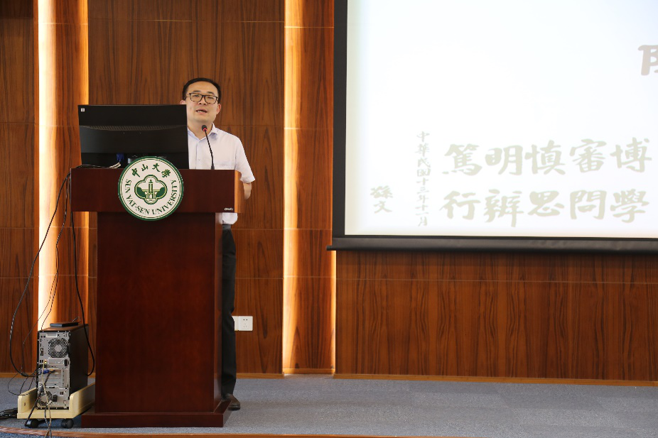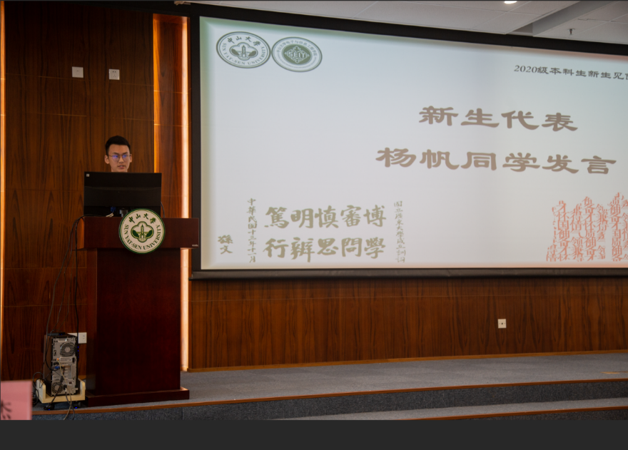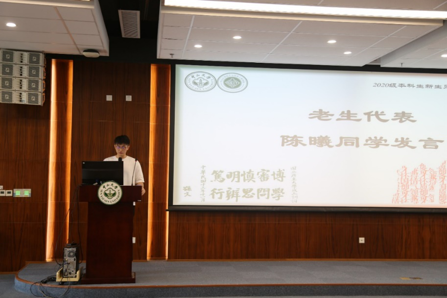 老生代表陈曦同学发言,作为全面发展的优秀学子,他首先以学长身份向师弟师妹们表示欢迎,并结合自身在专业学习、学科竞赛、体育社团等多领域的优异表现,鼓励新生们全面发展、健康成长、学在中大、追求卓越。