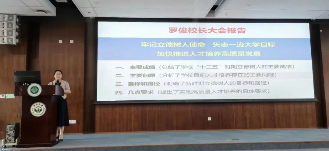 邓少芝院长首先重点传达了罗俊校长作的《牢记立德树人使命 矢志一流大学目标 加快推进人才培养高质量发展》大会主题报告精神。报告总结了学校“十三五”时期立德树人的主要成绩,分析了学校目前人才培养存在的主要问题,明确了新时期立德树人的目标和路径,提出了实现高质量人才培养的具体要求。报告主题鲜明、内涵丰富,规划目标和实施路径都非常明确,为学校推进“十四五”规划指明前进方向。