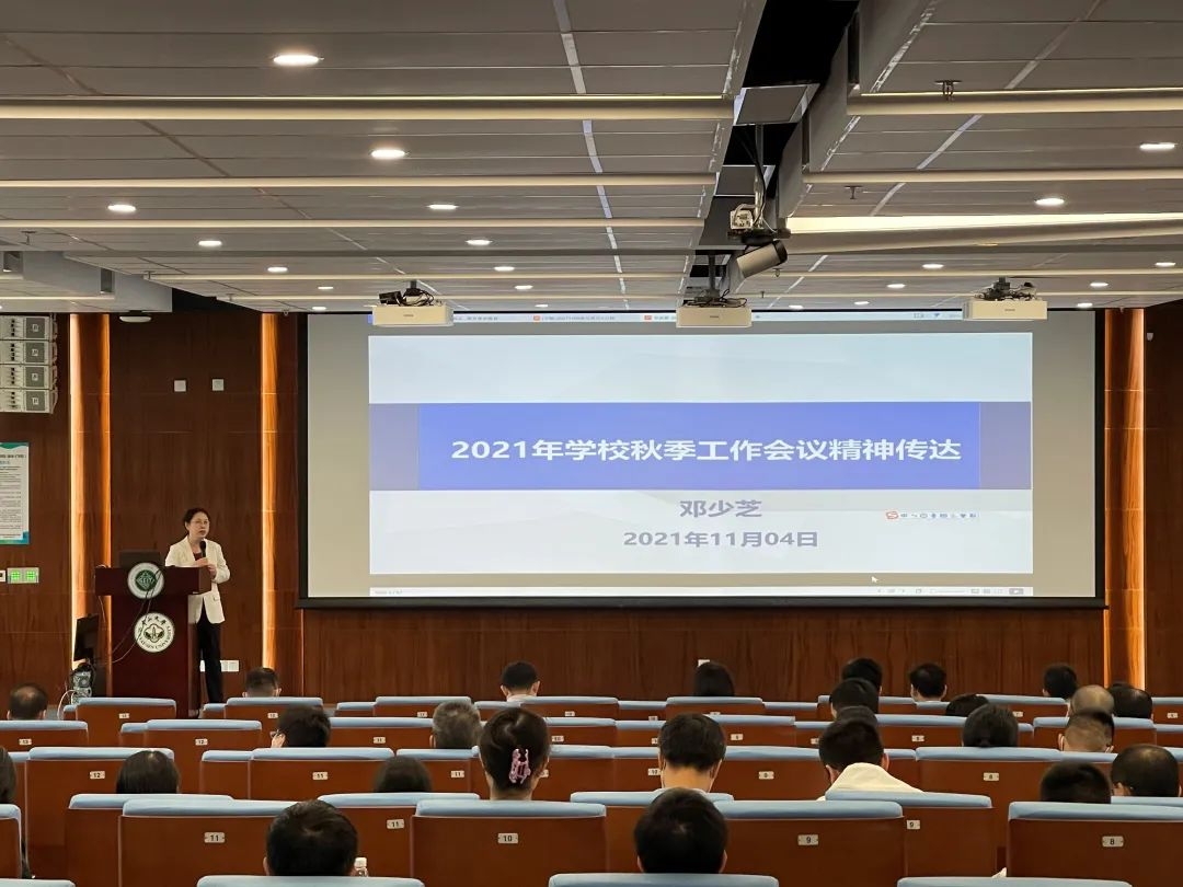 邓少芝院长首先重点传达了罗俊校长作的题为“学习贯彻中央人才工作会议精神,努力推进中国特色世界一流大学建设”的大会报告精神。她带领学院全体教职工再次深入学习领会习近平总书记关于新时代人才工作的新理念新战略新举措,强调要继续做好“八个坚持”,增强做好人才工作的政治自觉、思想自觉、行动自觉,全方位培养、引进、用好人才。邓院长还传达了罗俊校长在报告中总结了“十三五”期间学校取得的优异成绩和存在的不足,并就罗校长提出的“十四五”期间学校在党的建设、学科建设、人才培养、科学研究、人才队伍、管理服务等方面“高追求、高质量、高水平、高标准、高品质”的工作目标和工作要求做了传达解读,希望全院教职员工切实提高政治站位,主动担负使命职责,时刻与学校发展同心同向同步同行。
