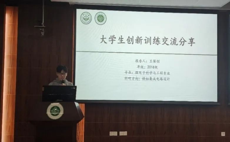 随后,在2021年“大创训练项目”中表现优异的两名本科生代表进行经验分享。18级微电子科学与技术专业的王保创同学主持开展“激光雷达专用全集成线性稳压器”项目,其相关成果获得全国大学生集成电路创新创业大赛一等奖,并且申请国家发明专利一项,现已通过“推免”,即将前往中国科学技术大学攻读研究生。王同学结合个人学习经历,深入阐释了 “大创训练项目”跟本科四年学业的紧密关联,从课程修读、学科竞赛、科研成果到毕业论文、升学就业,可谓一脉相承、相互促进。