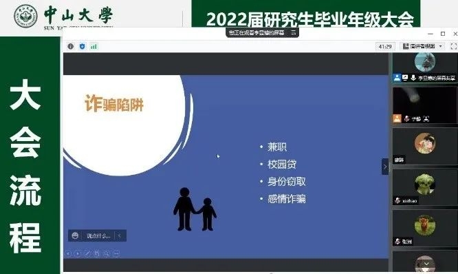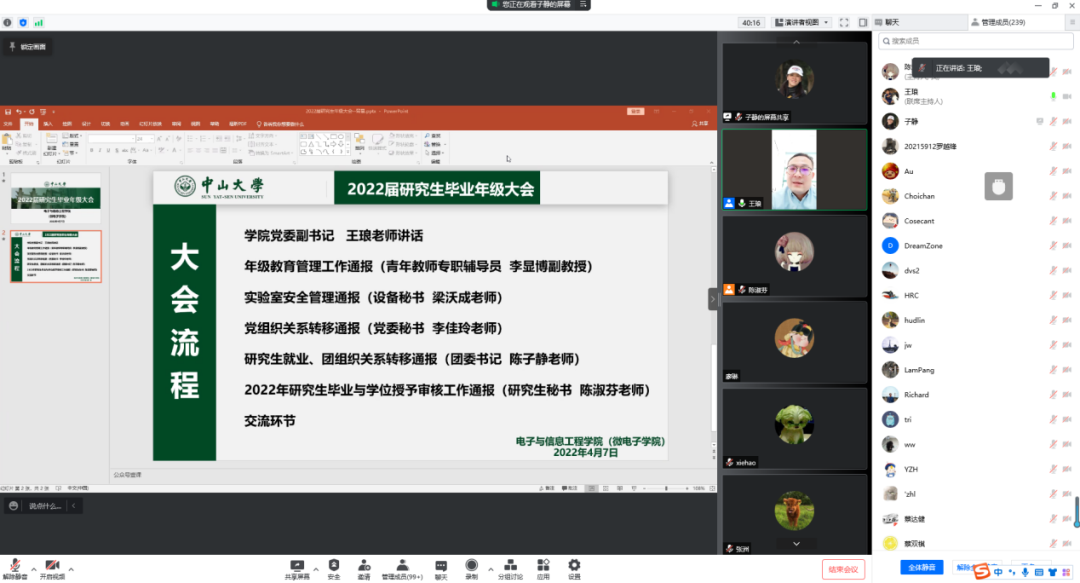 2022年毕业季已经来临,为切实做好2022届毕业生教育管理服务工作,帮助毕业生清楚了解各种毕业和就业注意事项,强化毕业班学生的安全责任意识,2022年4月7日下午,WilliamHill线上召开2022届研究生毕业年级工作会议,逾260名同学共同参会。学院党委副书记王琅、团委书记陈子静、青年教师专职辅导员李显博、党务秘书李佳玲、设备秘书梁沃成、研究生秘书陈淑芬等参加会议,并分别就安全教育、就业派遣、党团关系转接、毕业与学位授予审核程序等方面进行详细分享介绍。会议由陈子静老师主持。