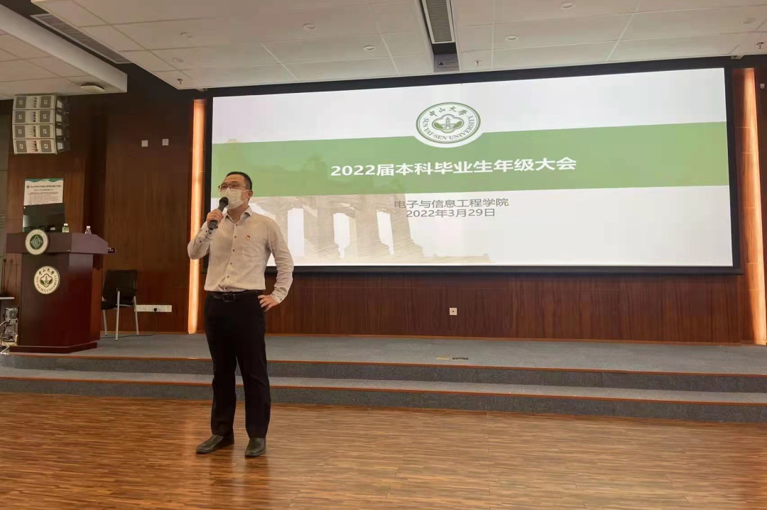 王琅副书记首先作开场动员讲话,他饱含深情地回顾了与同学们共同度过的四年时光,感慨大家在思想、学业和能力等全方位的成长与进步,称赞同学们在中大、在学院的光阴没有虚度,在大学这个人生重要阶段都能够以积极向上心态面对学习和生活的各种挑战。毕业之际来临,人生又一个转折点近在眼前,他勉励同学们不论目前结果是否符合预期,都要继续保持积极乐观的心态。人生道路道阻且长,行而不辍,未来可期,只要努力拼搏奋斗,拒绝“躺平”,未来一定会更精彩。王书记还就毕业前疫情防控、宿舍安全、电动车电池充电安全等进行重点提醒,希望同学们平安顺利毕业。