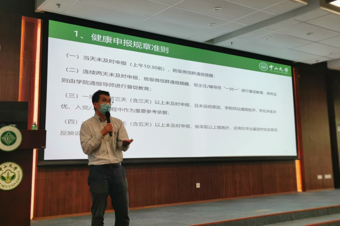 李凡老师围绕学生疫情防控工作做重点提醒教育,他指出当前疫情防控形势仍然复杂严峻,每位同学都应该切实担任其疫情防控个人主体责任,共同维护校园疫情防控安全。他强调了每日健康申报的重要性,督促同学们自觉按时健康申报,为自己和他人的健康负责。他结合学校和学院近期出台的疫情防控通知,进一步详细讲解了离校和返校的规范流程,呼吁同学们非必要不离校,离校和返校必须按照规定的流程进行审批。李凡老师还敦促没完成新冠疫苗全程接种的同学尽快接种,建立起保障健康的坚实防线。