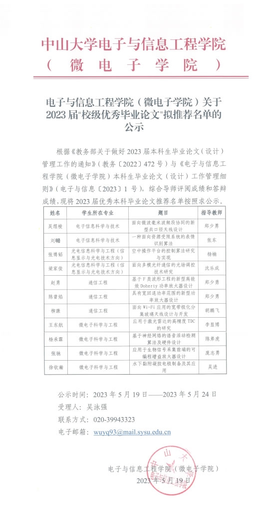 2023届“校级优秀毕业论文”拟推荐名单的公示