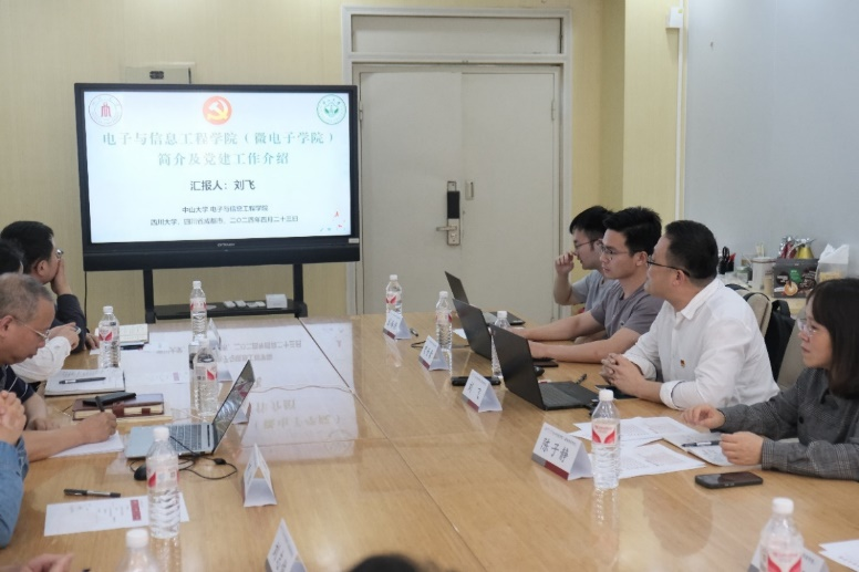 刘飞书记对四川大学电子信息学院的党建工作表示充分肯定,并介绍了我院的办学基本情况和党建工作亮点。刘书记强调,多年以来学院坚持党的领导,夯实基层党建,充分发挥“头雁效应”,以高质量党建助力学院在立德树人、科研创新、服务社会等方面不断取得新的成就。随后,与会人员围绕党纪学习教育、新工科自主人才培养、对外合作交流以及夯实基层党建等话题进行了深入探讨,现场气氛热烈融洽。