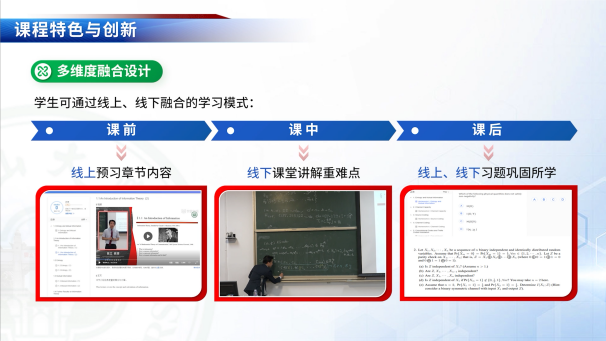 《信息论与编码》课程设有七大章节,第一至第二章节介绍信息论的基本概念和理论模型,包括信息熵、互信息和信道容量等,让学生理解信息论对现代通信系统的理论指导意义;第三章节介绍信源编码的基本原理和方法,包括Shannon-Fano编码和Huffman编码等,让学生了解信息压缩的原理和理论极限,掌握各种主流信源编码技术;第四至七章节介绍信道编码的基本原理和方法,包括香农信道编码定理及证明,循环码、卷积码、Turbo码和Reed-Solomon码等。围绕图1中的课程目标,课程以线上与线下融合的模式,将现代信息技术与线下课堂教学有机融合,显著提升了学生的学习效果。本课程学习难度大,陈立教授通过教学创新,利用自编讲义对知识进行系统性建构,将经典理论与前沿技术进行深度融合,帮助学生更好地理解和掌握课程知识。学生不仅可以在课堂上获得传统的互动式教学,还可利用现代信息技术在多媒体环境中进行丰富的课外学习。例如,学生可以利用线上教学视频与课程讲义提前学习基础知识,通过课堂讲解和板书加深理解,并进一步在课后利用线上习题加以巩固,实现良好的学习效果,如图2所示。图3展现了威廉williamhill的《信息论与编码》课堂。